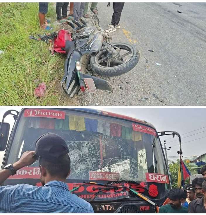पश्चिमबाट पूर्व तर्फ जादैै गरेको प्रदेश १ -०१ -००१ (ख) ३४३५ नम्बरको यात्रुवहाक बसले सोहि दिशाबाट जादै गरेको को.१६ प. ५३२२ नम्बरको मोटरसाईकल ठक्कर दिदाँ मोटरसाइकल चालक को घटनास्थलमा नै ज्यान गएको जिल्ला प्रहरी कार्यालय झापाले जनाएको छ ।