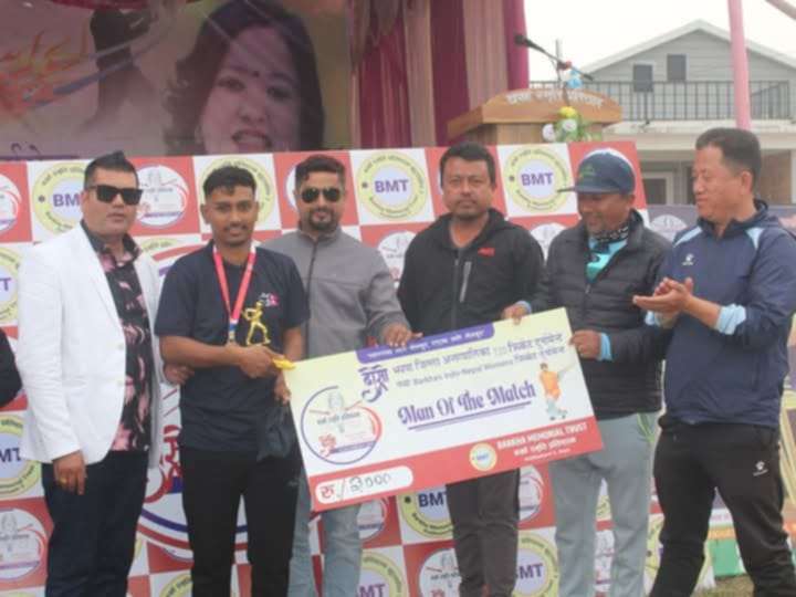 बिर्तामोड लाई बिजय दिलाउन महत्त्वपूर्ण ६ विकेट लिएका बिर्तामोडका बिजय कार्की खेलको म्यान अफ द म्याच घोषित हुँदै नगद ३ हजार र ट्रफी प्राप्त गरे ।
