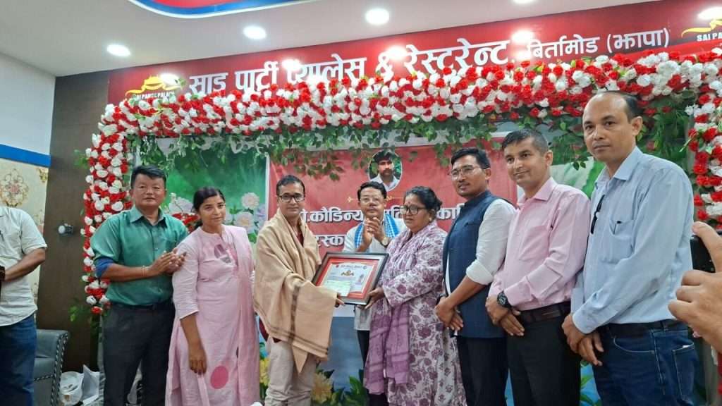 बिर्तामोड साउन ७ ।। स्वर्गीय देवकुमार आचार्य ‘डी कौडिण्य’को स्मृति दिवसको अवसरमा पत्रकार उद्धव पुरी सम्मानित भएका छन् । बुधबार स्वर्गीय आचार्यको २३औँ स्मृति दिवसको अवसरमा उनलाई सम्मान गरिएको हो ।