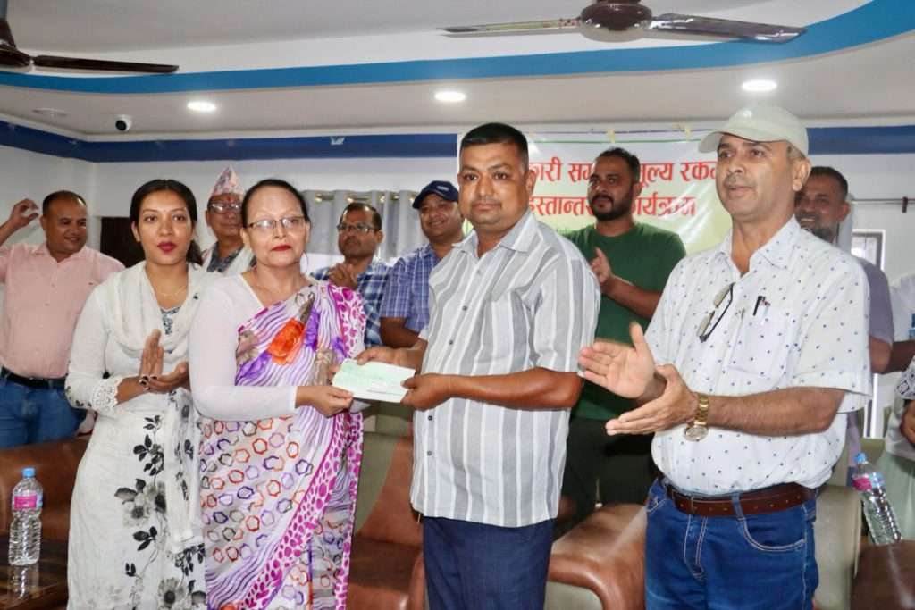 नगरपालिकाको सभाहलमा आयोजित एक कार्यक्रमका बीच नगर प्रमुख पवित्रा महतारा प्रसाईले १२ लाख ८१ हजार ८ सय ८७ रुपैयाँ बराबरको चेक हस्तान्तरण गर्नु भएको हो ।