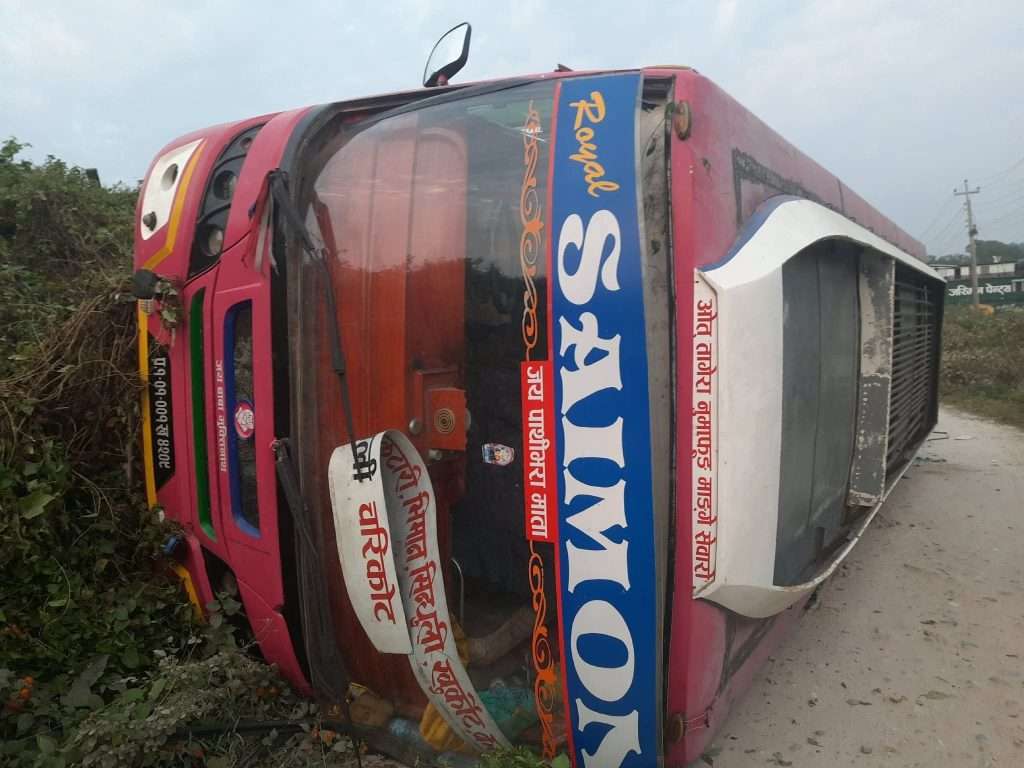 प्रदेश १–०१–००१ क ४२०९ नम्बरको रात्रि बस अनियन्त्रित भएर सडकबाट तल बायाँतर्फ पल्टिएको प्रहरीले जनाएको छ । दुर्घटनामा बसमा रहेका २५ जनामध्ये १९ जना घाइते भएका हुन् । छजना आआफ्नो स्थानतर्फ गएका छन् ।