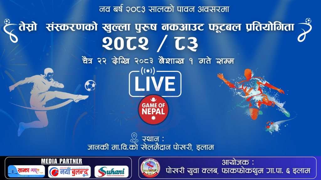 फाकफोकथुम इलाम ! फागुन २४।। नयाँ वर्ष २०८३ को अवसरमा पोखरी युथ क्लबको आयोजनामा तेस्रो संस्करण खुल्ला पुरुष नकआउट फुटबल प्रतियोगिता आयोजना हुने भएको छ।
