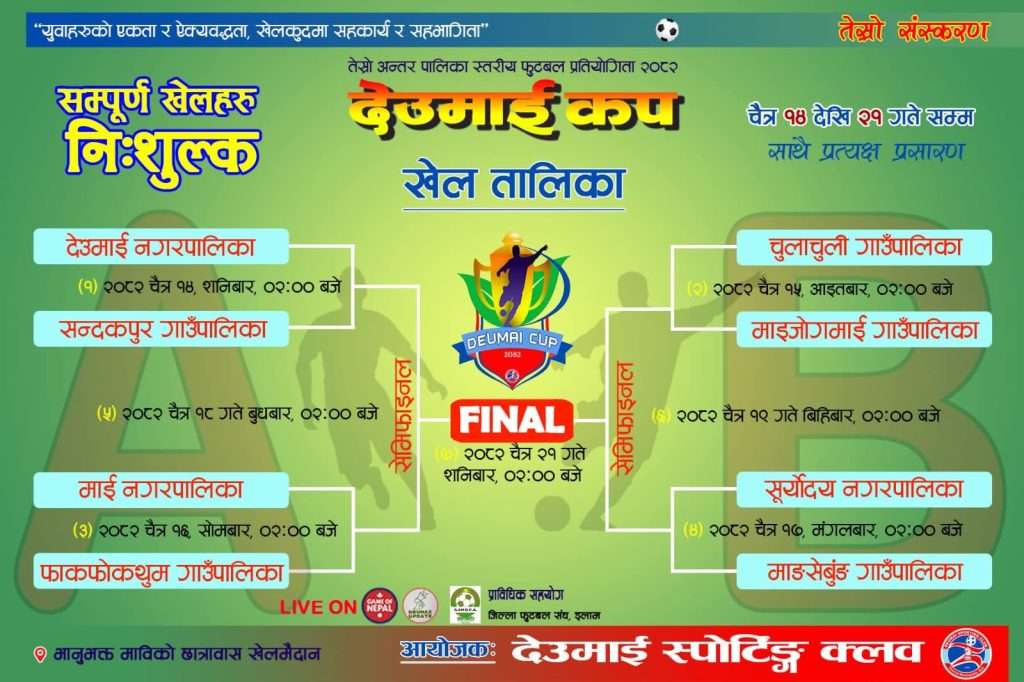 देउमाई स्पोर्टिङ क्लबको कार्यालयमा आज आयोजित एक विशेष कार्यक्रममा स्थानीय जनप्रतिनिधि, खेलकुद क्षेत्रसँग सम्बन्धित व्यक्तित्व, क्लबका पदाधिकारी, खेलाडी गाउँपालिकाका खेल प्रतिनिधि तथा पत्रकारहरूको उपस्थितिमा खेल तालिका सार्वजनिक गरिएको हो।