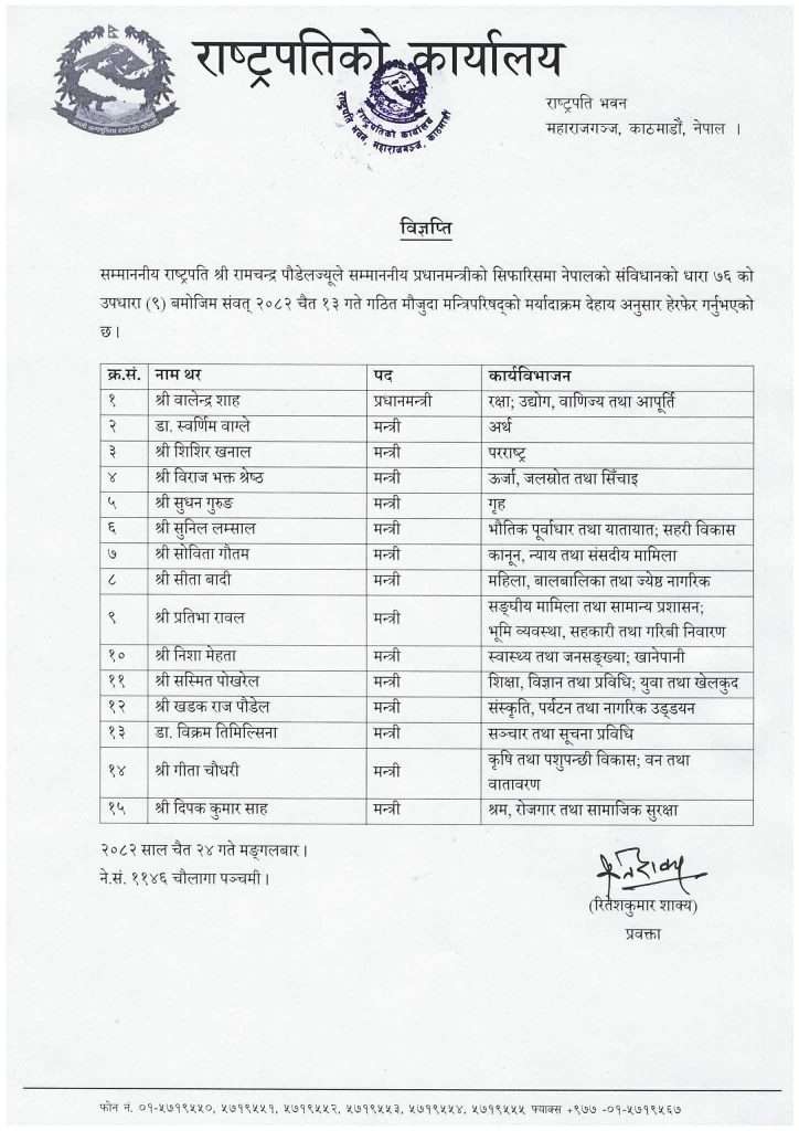 सङ्घीय मन्त्रिपरिषद् सदस्यहरूको मर्यादाक्रम हेरफेर भएको छ । प्रधानमन्त्री बालेन्द्र शाहको सिफारिशमा राष्ट्रपति रामचन्द्र पौडेलले नेपालको संविधानको धारा ७६ को उपधारा (९) अनुसार मर्यादाक्रम हेरफेर गर्नुभएको हो ।